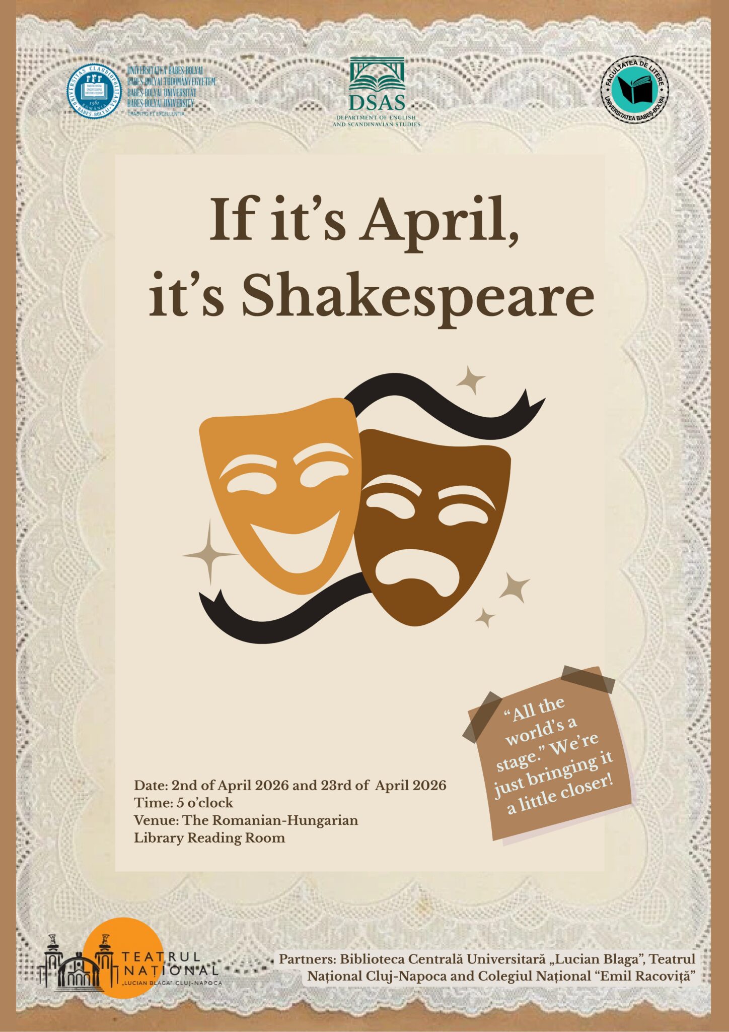 Dacă e aprilie, e Shakespeare, cel puțin la DSAS, așa că vă invităm să-l sărbătorim